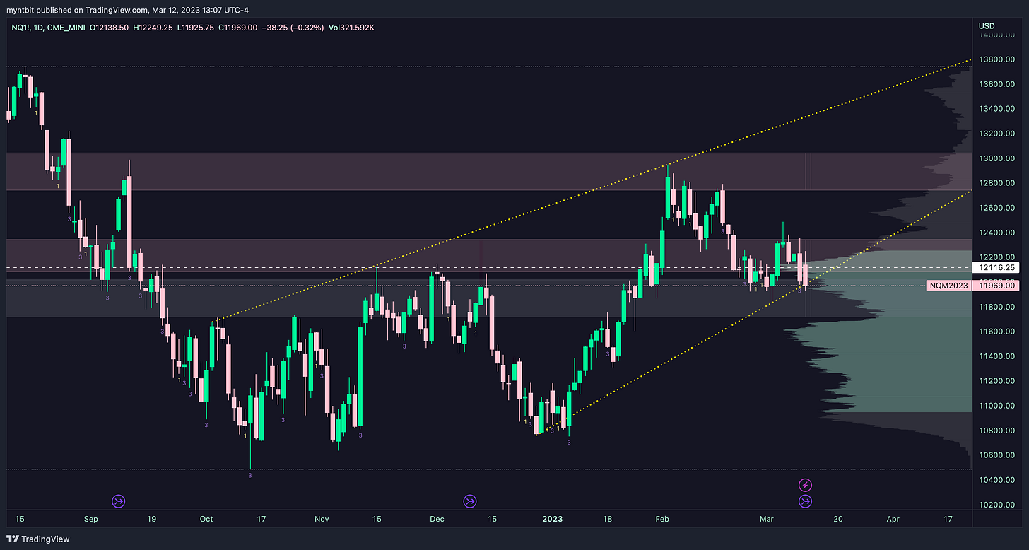 Upside: If we hold and stay above 12000, then we can test 12180-12250 (back into the consolidation zone) and the next level up would be near the top of the range at 12400.