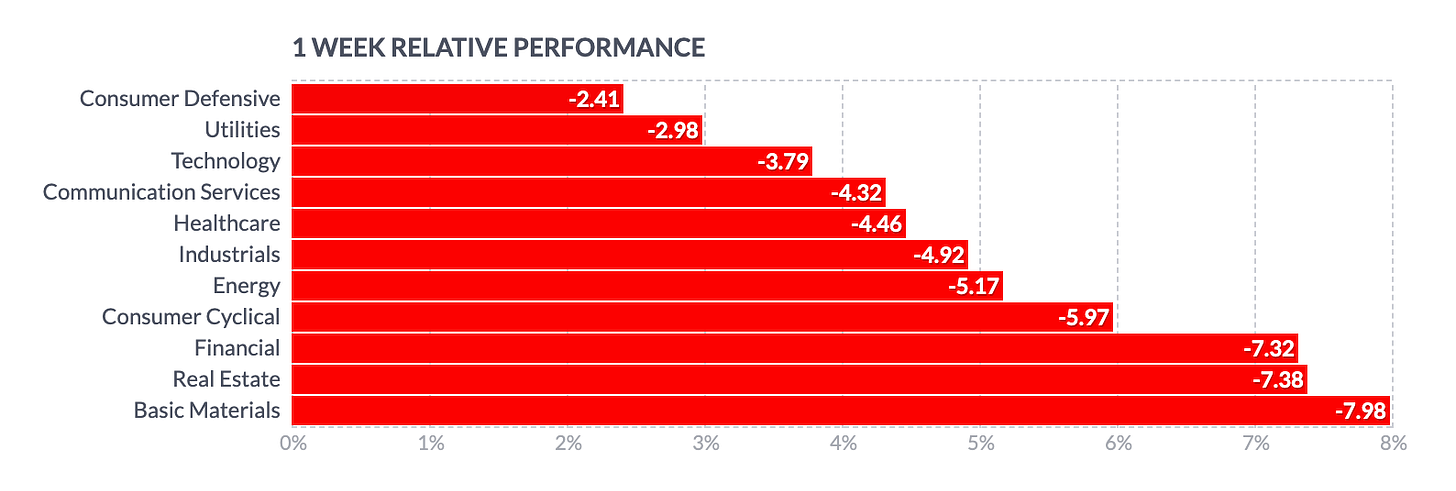 This week was a losing week for the stock market. The S&P 500 saw downside moves, slicing through support at its 50-day and 200-day moving averages. The market started to shake after Fed Chair Powell's remarks to Congress caused investors to rethink the possibility of a 50 basis points rate hike at the March FOMC meeting. The news of SVB Financial's Silicon Valley Bank being shut down added to concerns about a possible contagion effect. As a result, the 2-yr note yield declined 27 basis points, and the 10-yr note yield dropped 26 basis points. The worst-performing sectors this week were the financial, materials, real estate, consumer discretionary, energy, and industrial sectors. The consumer staples sector was the best performing, declining 1.9%.
