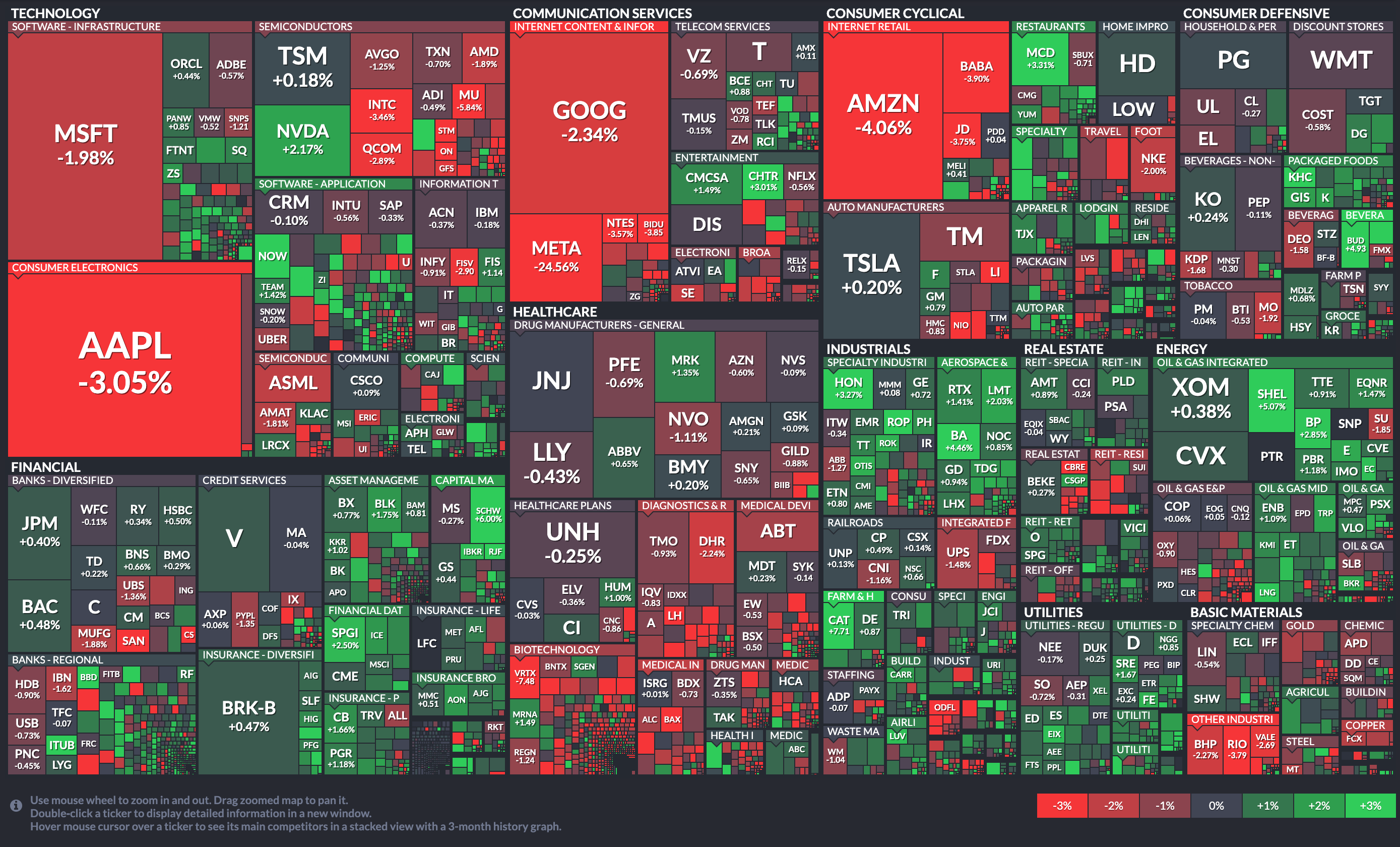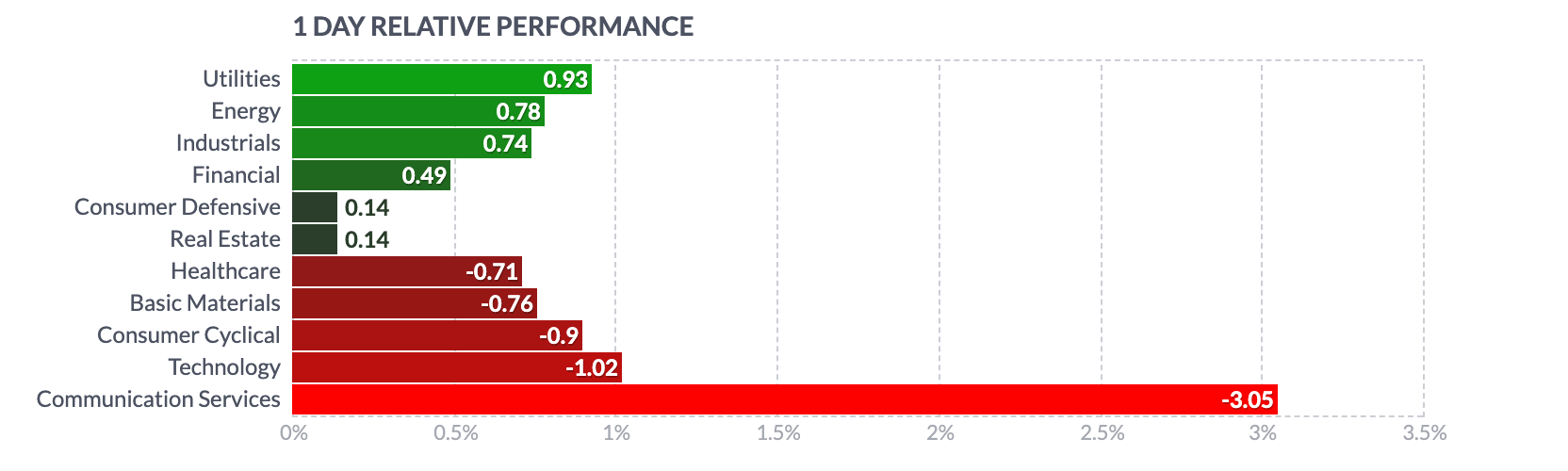 Roughly half of the S&P 500 sectors closed in the red. The poor performance from Meta Platforms drove the S&P 500 communication services sector (-4.1%) to last place today. The information technology (-1.3) and consumer discretionary sectors (-0.7) also struggled as their respective mega cap components, Apple and Amazon.com, weighed on sector performance.