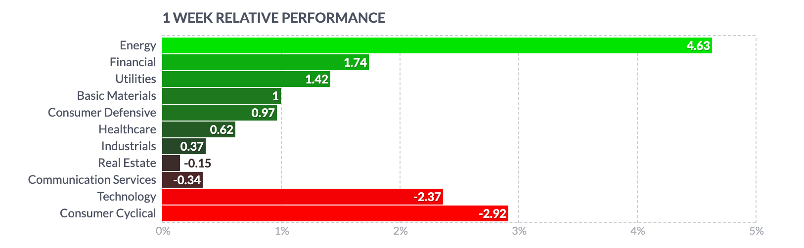 Sector performance this week overall was mixed. Six sectors finished higher and five sectors finished lower. The best performing sectors were energy (+4.4%), utilities (+1.4%), financials (+1.4%), and consumer staples (+1.0%). The weakest links this week were the consumer discretionary (-3.1%) and information technology (-2.0%) sectors, which were dragged down by their mega cap components. The Vanguard Mega Cap Growth ETF (MGK) declined 2.1% for the week.