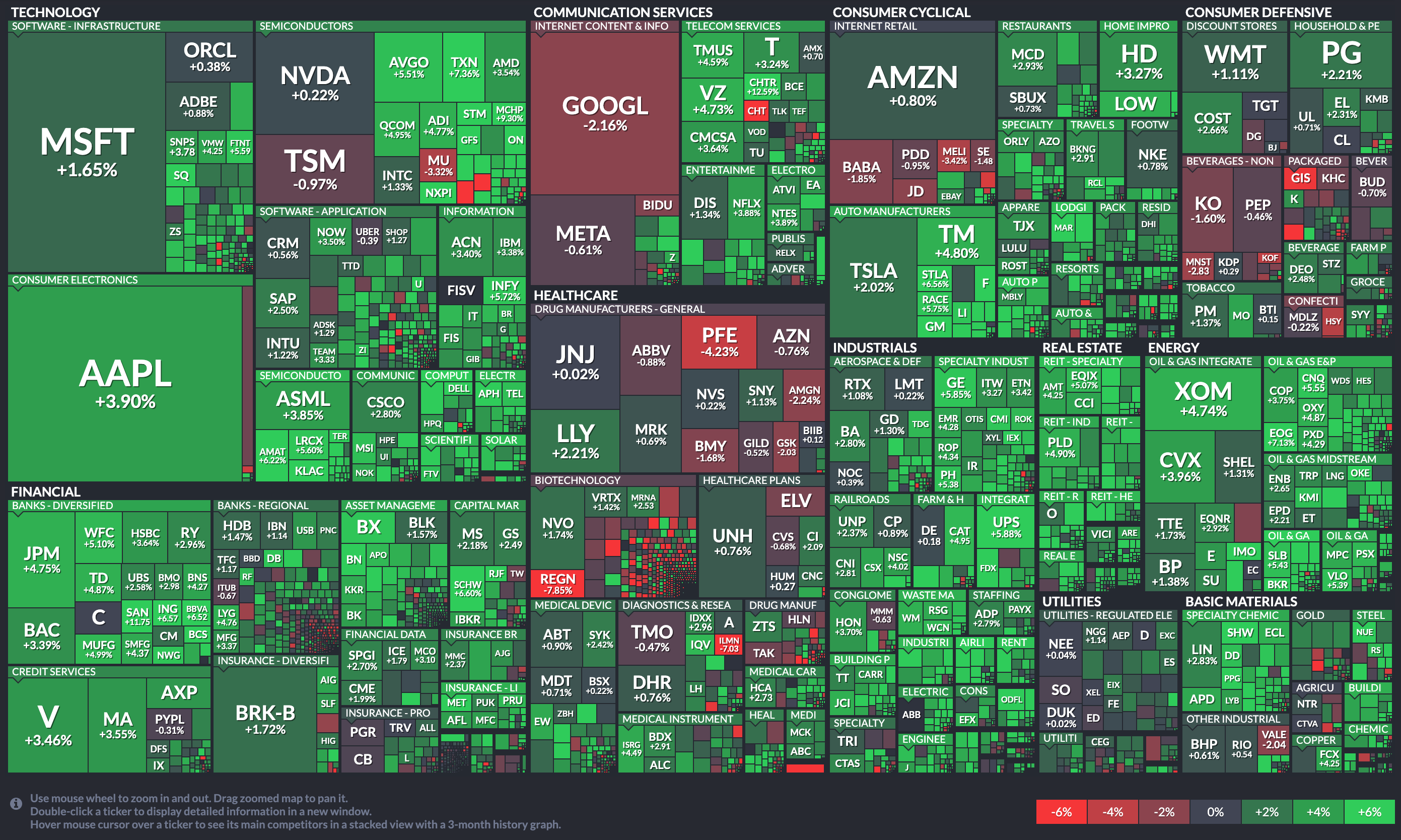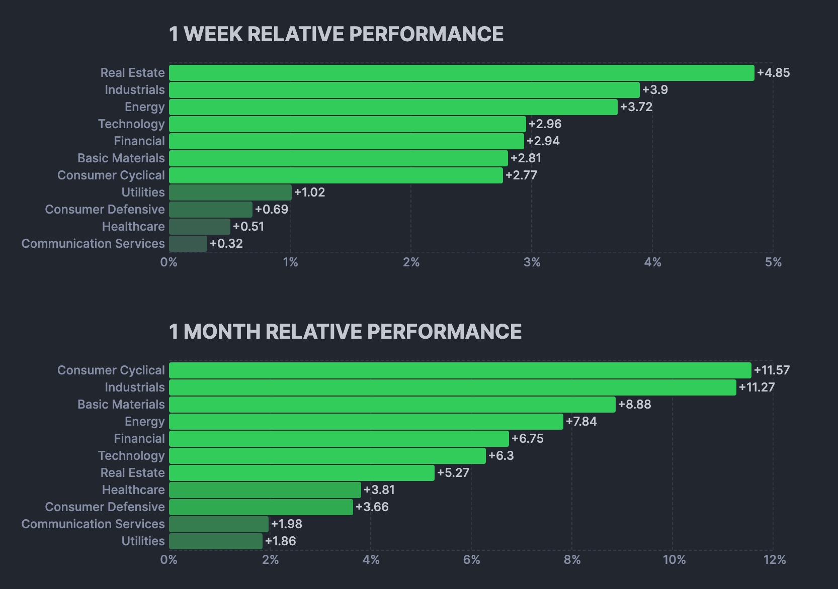 In terms of sectors, countercyclical consumer staples, healthcare, and utilities performed relatively poorly, while communication services experienced pressure due to Alphabet's (GOOG) 1.7% decline after downgrades from UBS and Bernstein. Real estate and energy were the top-performing sectors of the week, followed by materials, industrials, financials, information technology, and consumer discretionary.